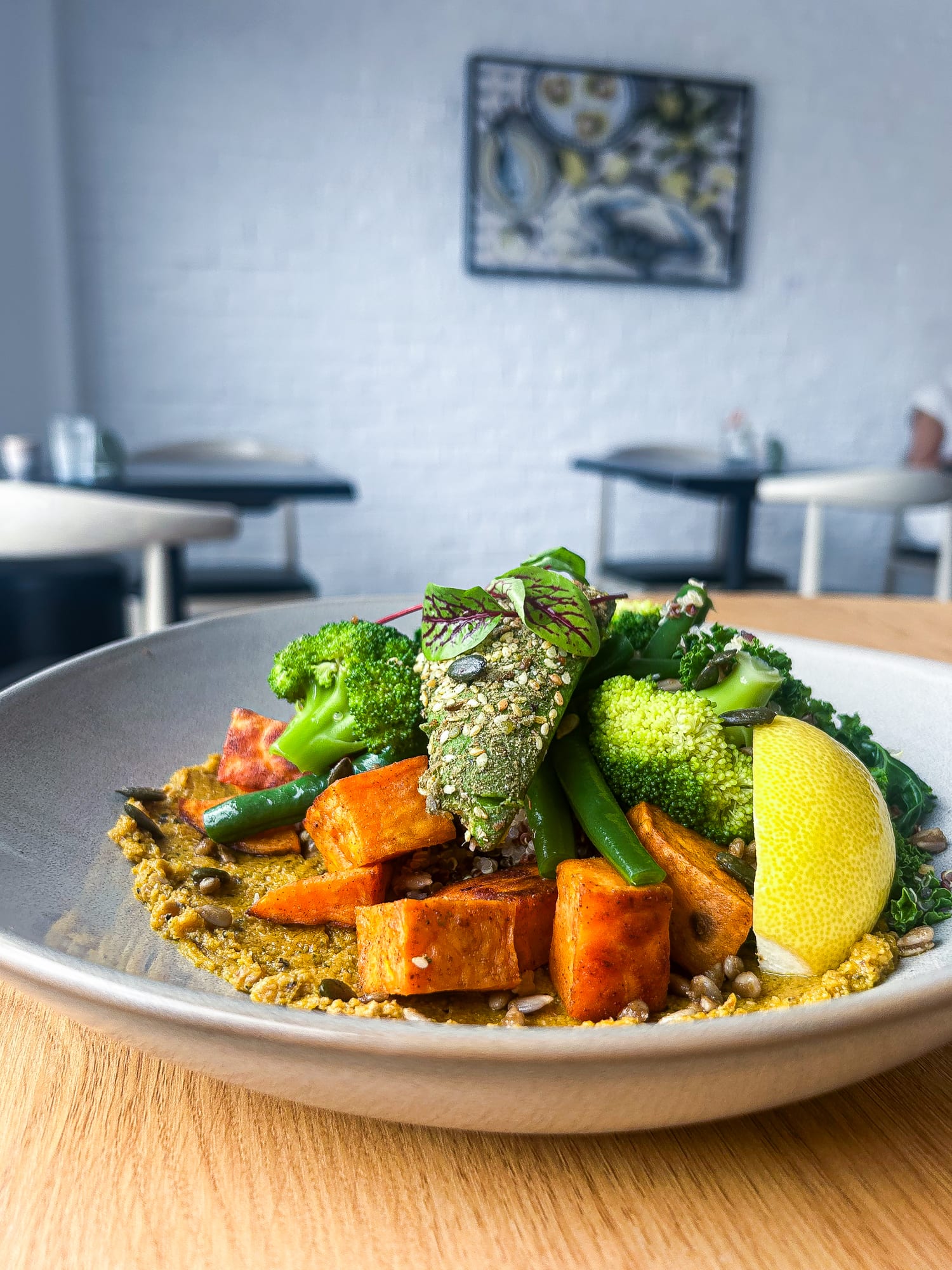 zaatar crusted avocado, seasonal greens, roast sweet potato, quinoa pumpkin hummus, mixed seeds gf,df,v,vg- add grilled pita (1) gfo +2