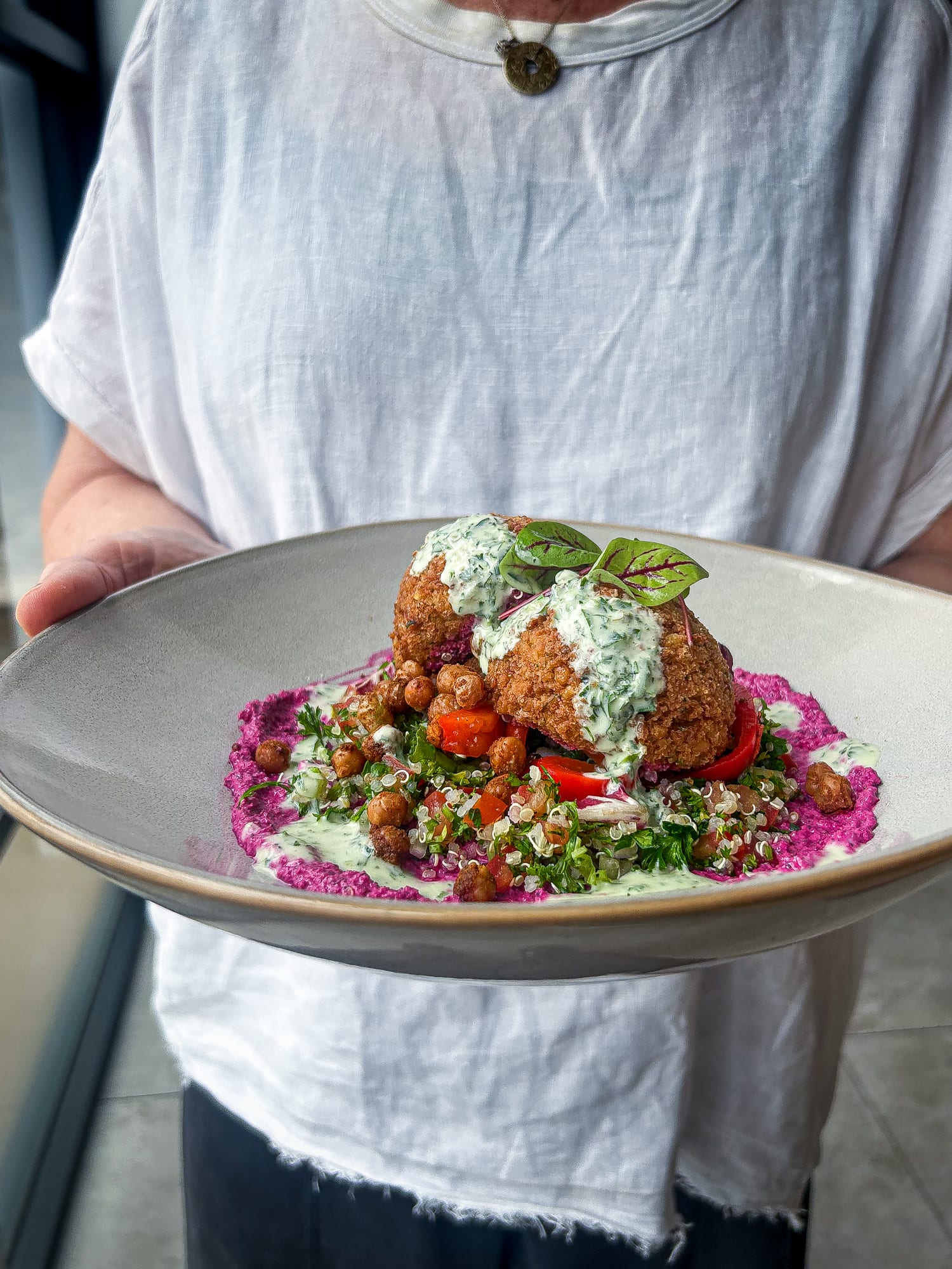 quinoa tabouli, marinated capsicum, spiced chickpeas, whipped beetroot feta, rocket, radicchio, green goddess dressing gf,v,vgo- add grilled pita (1) gfo +2