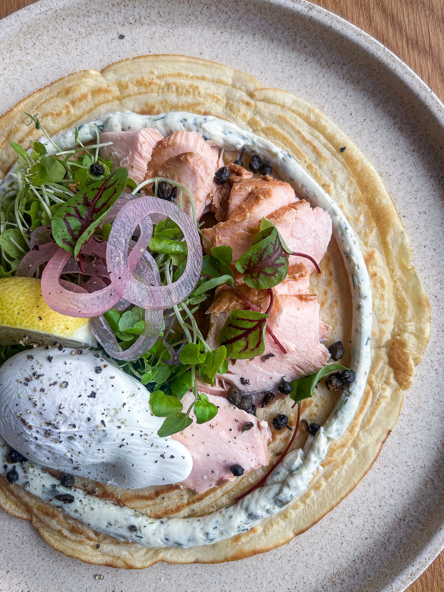 lemon herb yoghurt, spinach, poached egg, gremolata, grilled pita gfoLemon coconut ricotta hot cakes 25